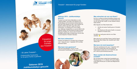 Zum 50jährigen Stadtjubiläum ist auch der Blick in die Zukunft wichtig. Die Pressestelle der Stadt Troisdorf lädt junge Familien, die im Zeitraum vom 1. Januar bis 1. September 2019 ein Baby bekommen haben oder bekommen, zur Teilnahme an einem Fotowettbewerb ein. Wir wünschen uns von Ihnen ein Foto von Ihnen mit Ihrem Kind/Ihren Kindern und ein Statement, warum Sie gerne in Troisdorf leben und was Sie sich für Ihre Familie von der Zukunft in dieser Stadt erhoffen.