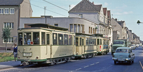 Prägendes Gebäude an der Kreuzung Kölner Straße/Klevstraße ist das Eckhaus von Elektro Menne. Ein Immobilienunternehmen hat es umfassend renoviert und nutzt es nun als Bürogebäude. Die Fotos zeigen die stark befahrene Kölner Straße mit der in den 60er-Jahren noch verkehrenden Straßenbahn Rhabarberschlitten. Das Eckhaus an der Kreuzung Hospitalstraße/Klevstraße wurde später aufgestockt. Die zweite Ansicht zeigt die Kreuzung nach dem Umbau zur 1983 eingeweihten ersten Troisdorfer Fußgängerzone mit ihrem Klinkerbelag. Aus der stark befahrenen Kreuzung war der Kölner Platz geworden.