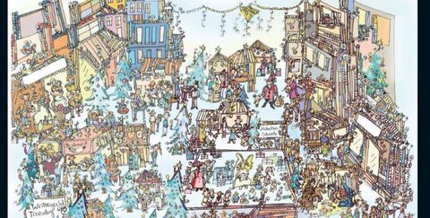 Die erste Troisdorfer Weihnachtskarte zeigt ein romantisch-weihnachtliches Wimmelbild aus der Feder der Zeichnerin Eva-Marie Loesgen. Ihre Motive von Shoppern, Freifunkern oder auch Bauarbeitern sind bereits auf großen Bannern der ZiTi-Kampagne in der Fußgängerzone öffentlich zu sehen.