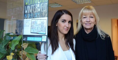 „Die Motive sind stimmungsvoll, der Wegweiser in die Alte Poststraße ist ein schönes Signal für die Geschäftsleute dort“, findet Angelika Zimmermann, Büroleiterin der Niederlassung von Immobilien Kittlaus an der Einmündung Kölner Straße/Alte Poststraße. Zu sehen ist sie hier mit ihrer Kollegin Anja Raspudic. Links daneben das Plakat, das auf die Weihnachtskarten der ZiTi-Kampagne aufmerksam macht. Die Zukunftsinitiative Troisdorf Innenstadt und die Werbegemeinschaft Troisdorf Aktiv haben diesen kostenlosen Weihnachtsgruß den Troisdorfer Geschäftsleuten zur kostenlosen Verteilung in ihre Netzwerke zur Verfügung gestellt.