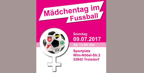 Die Vereine Sportfreunde Troisdorf 05, 1. FC Spich 1911 e.V., SV Rot-Weiß Kriegsdorf und TuS 07 Oberlar bieten speziell für fußballinteressierte Mädchen in den Jahrgängen 2011 - 2004 einen Fußballtag mit Schnuppertraining & Fußballspielen an. Ort: Sportpark Oberlar, Wim-Nöbel-Straße, 53842 Troisdorf am Sonntag, den 09.07.2017 ab 13:00 Uhr.