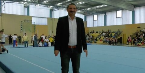 Dieser mobile Turnerboden ist für jeden Verein und jede Turnhalle in Troisdorf nutzbar. Bürgermeister Alexander Biber und der 1. stellv. Bürgermeister Erkan Zorlu (siehe Foto) waren mit vor Ort.