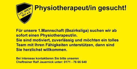 Der 1. FC Spich sucht für seine 1. Mannschaft (Bezirksliga) eine/n Physiotherapeut/in
