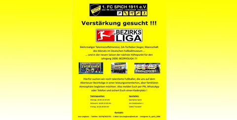 Hierfür sucht der Verein noch talentierte Fußballer, die sich beim Abenteuer Bezirksliga in einer leistungsorientierten, aber familiären Atmosphäre einbringen möchten.