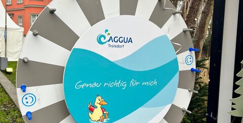 Auf dem diesjährigen Weihnachtsmarkt rund um die Burg Wissem sorgte das AGGUA TROISDORF für eine besondere Bescherung: Während das charmante Glasfaser-Maskottchen JETI gemeinsam mit dem niedlichen Stadtwerke-Engel kleine Naschereien verteilte, zogen zahlreiche Besucher zur weihnachtlich dekorierten Bude des AGGUA TROISDORF, um dort am Glücksrad zu drehen. Nach dem Motto „Jeder Cent zählt“ durften dort kleine wie große Besucher ihr Glück versuchen, sich farbenfrohen Badeschaum, Kinder-Freikarten und andere Überraschungen zu sichern. Viele Menschen zeigten sich ausgesprochen großzügig – sage und schreibe knapp 850 Euro kamen bei der Aktion für den guten Zweck zusammen.
