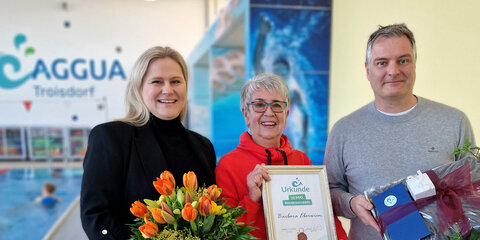 Foto: AGGUA-Geschäftsführerin Daniela Simon (links) und Badleiter Achim Kronberg (rechts) gratulieren ihrer 10-millionsten Besucherin Barbara Eberwien, die dem AGGUA TROISDORF seit nunmehr 25 Jahren die Treue hält.