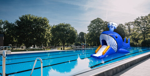 Bei schönem Wetter wird der 12 Meter lange WALdemar im Schwimmerbecken des Freibads bereitstehen. Falls das Wetter nicht mitspielt, verlagert sich der große Wasserspaß in den Innenbereich