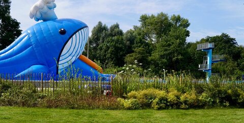 Dass der Familientag ein Riesenspaß wird, darf man wörtlich verstehen: Im Sportbecken sorgt eine schwimmende Riesenattraktion für leuchtende Kinderaugen und jede Menge spritzige Action. Der blaue Wal WALdemar wird im Wasser warten und zum Balancieren, Klettern und Springen einladen. Bei schlechtem Wetter zieht WALDemar einfach ins Erlebnisbad um – so bleibt der Badespaß wetterunabhängig erhalten. Treue AGGUA-Freibadbesucher kennen den gigantischen blauen Publikumsliebling bereits aus dem letzten Jahr – auf ihm ist ausgelassener Wasserspaß garantiert.