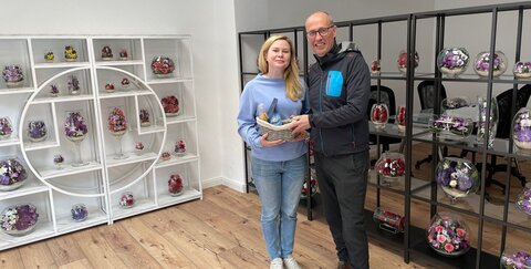 „Die Idee, hermetisch verschlossene Blumen in schönen Vasen zu verkaufen, kam uns in der Coronazeit als es nicht möglich war, in Blumenläden zu gehen und frische Ware zu kaufen.“ Anna Kravchenko Geschäftsführerin des gerade neu eröffneten Ladens in der Kölner Str. 70 (direkt gegenüber von Peek & Cloppenburg) mit dem Namen Anfloria beschreibt den Startpunkt ihrer ungewöhnlichen Geschäftsidee im Jahr 2020. „Zuerst haben wir die Blumenvasen-Kunstwerke nur online verkauft, jetzt kommt der stationäre Verkauf dazu. So sind wir für die Zukunft stabiler aufgestellt und können unseren Kunden die attraktiven Designs direkt präsentieren“, sagt Ehemann Vasyl Trotskyi, der das Geschäft gemeinsam mit seiner Frau Anna Kravchenko führt.