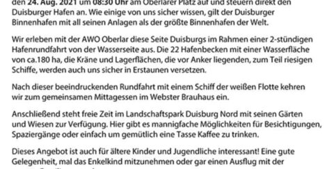 24.06.2021: Fahrt nach Duisburg mit Hafenrundfahrt und Landschaftspark am 24.08.2021