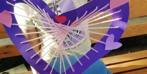 Die Kinder auf dem Abenteuerspielplatz Troisdorf waren kreativ und haben tolle Muttertagsherzentraumfänger gebastelt. Der Flyer auf dem Foto macht nebenbei noch ganz geschickt Schleichwerbung für den Kinderflohmarkt am 13. Mai 2022.