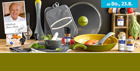 Küchenideen vom Profi erhaltet ihr in der neuen Aldi-Aktion: Ausgewählte Artikel aus der Alfons Schubeck Edition wie Schmorpfanne, Mörser, Geschirrtücher, Ofenhandschuhe und feine Lebensmittel wie Pralinen und Liköre finder tihr ab Donnerstag in euer Aldi-Filiale in der Kölner Straße. Nur solange der Vorrat reicht!