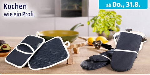 Tolle Utensilien rund um die Küche bietet euch Aldi mit seiner neuen Aktion - Schürzen, Topflappen, Tischwäsche oder Pfannen in bester Qualität!
