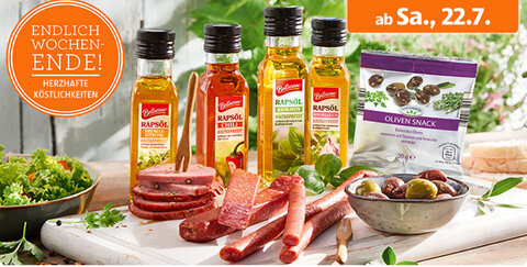 Aldi hat ab morgen allerlei Köstlichkeiten im Angebot. Neben mehreren Sorten Rapsöl, wie Thymian-Zitrone, Chili, Basilikum und Knoblauch, gibt es auch verschiedene Salamisorten, sowie Olivensnacks und Salatdressing. Perfektes Zubehör für einen ausgedehnten Wochenendsnack.