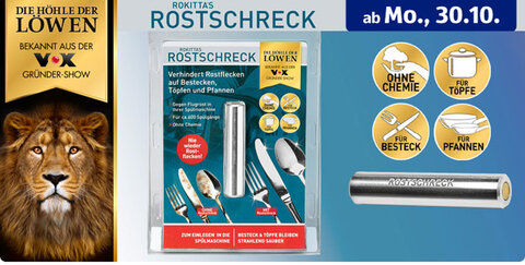 Ab heute gibt es Rokitta's Rostschreck bei Aldi zu kaufen. Das aus "Der Höhle der Löwen" bekannte Produkt verhindert Rostflecken auf Bestecken, Töpfen und Pfannen und wird so zum unerlässlichen Gegenstand für jede Spülmaschine. Sichert euch jetzt für 7,99€ das tolle Helferlein!