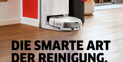 In der smarten Absaugstation wird der Staubbehälter des Wisch- und Saugroboters RCV 5 regelmäßig automatisch entleert. Dank der Ladefunktion der Absaugstation wird der Akku des Roboters auch gleich wieder aufgeladen.