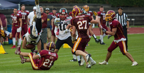 Die Troisdorf Jets hatten bei ihrem letzten Ligaauftritt am vergangen Samstag schon damit gerechnet, dass es ein schweres Spiel werden würde. Immerhin war mit den Solingen Paladins der ungeschlagene Ligaprimus zu Gast im Aggerstadion. Am Ende fiel die Niederlage gegen die mit Abstand beste Defense der Liga mit einem 0:33 aber dann doch höher aus, als es die Jets erwartet hätten. Nach einer bärenstarken Hinrunde ging es für die Troisdorfer Footballer zum Saisonende hin immer weiter bergab. Zunächst noch sicher auf Platz 2 der Tabelle und mit der Aussicht, den Tabellenführer vielleicht am Ende noch ärgern zu können, fingen sich die Jets eine Niederlage nach der anderen ein.