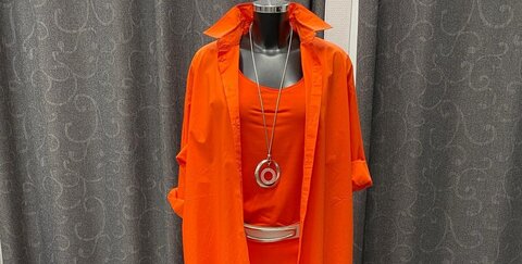 Ein luftig leichtes Arrangement in kräftigen Orange-Tönen - aufgelockert durch weiße Sneaker, eine silberfarbene Statement-Kette und den passenden Gürtel.