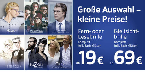 Sie erhalten eine Brille in Sehstärke bereits ab 19,- EUR oder in Gleitsicht ab 69,- EUR. Kommen Sie jetzt vorbei, lassen Sie sich von den tollen neuen Exklusivmarken inspirieren und sparen Sie bei hochwertigen Brillen.