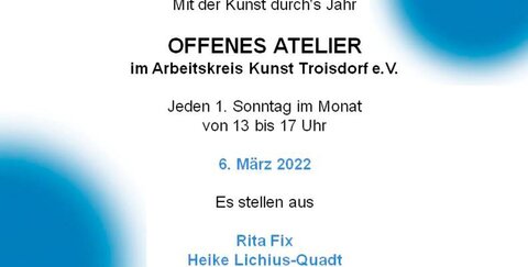 Im Atelier des Arbeitskreises Kunst Troisdorf ist am Sonntag, den 6. März 2022, von 13:00 bis 17:00 Uhr im Rahmen des Offenen Ateliers wieder die Kunst präsent. Rita Fix und Heike Lichius-Quadt zeigen einen abwechslungsreichen Querschnitt in ihr Schaffen.
