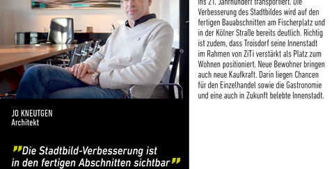 Die Zukunfts-Initiative Troisdorf Innenstadt unterstütze ich, weil sie unser Zentrum ins 21. Jahrhundert transportiert. Die Verbesserung des Stadtbildes wird auf den fertigen Bauabschnitten am Fischerplatz und in der Kölner Straße bereits deutlich. Richtig ist zudem, dass Troisdorf seine Innenstadt im Rahmen von ZiTi verstärkt als Platz zum Wohnen positioniert. Neue Bewohner bringen auch neue Kaufkraft. Darin liegen Chancen für den Einzelhandel sowie die Gastronomie und eine auch in Zukunft belebte Innenstadt.