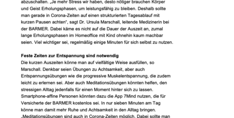 Die kurzen Auszeiten könne man auf vielfältige Weise ausfüllen, so Marschall. Denkbar seien Übungen zu Achtsamkeit, aber auch Entspannungsübungen wie die progressive Muskelentspannung, die zudem leicht zu erlernen sei. Aber auch Meditationsübungen könnten helfen, den stressigen Alltag jedenfalls für einen Moment hinter sich zu lassen. Smartphone-affine Personen könnten dazu die App 7Mind nutzen, die für Versicherte der BARMER kostenlos sei. In nur sieben Minuten am Tag könne man damit mehr Ruhe und Achtsamkeit in den Alltag bringen.„Meditationsübungen sind auch in Corona-Zeiten möglich. Dabei sollte man zu Beginn nicht zu viel von sich erwarten. Wer aber täglich für einige Minuten meditiert und am Ball bleibt, der kann nachhaltige Erfolge spüren“, sagt Marschall. Geübte könnten sich das Entspannungsgefühl zudem auch in stressigen Momenten schnell zurückholen.