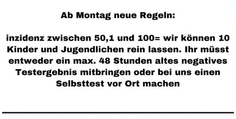 Inzidenz zwischen 50,1 und 100= Es können 10 Kinder und Jugendlichen rein. Die Kinder und Jugendlichen müssen entweder ein max. 48 Stunden altes negatives Testergebnis mitbringen oder Vorort einen Selbsttest machen.