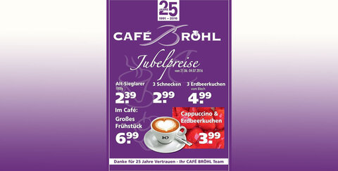 Das CAFÉ-BRÖHL in Sieglar feiert am 21.06.2016 seinen 25. Geburtstag! Die Familie Thomas Bröhl und das Café-Bröhl Team bedankt sich mit Jubelpreisen für euer langjähriges Vertrauen und die Treue!