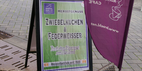 Bei Bröhl gibt es jetzt passend zum Herbstanfang Zwiebelkuchen und Federweisser nach altem Hausrezept von Opa Josef.