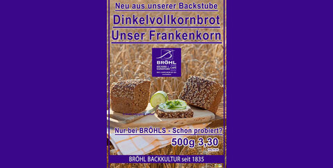 Jetzt neu aus der Backstube von Bröhl: das Dinkelvollkornbrot - Unser Frankenkorn. Zum Probierpreis für nur 3,30€ für 500g.