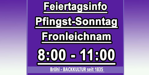 Auch an den Feiertagen ist Bröhls mit vielen Leckereien gerne für euch da - Pfingst-Sonntag & Fronleichnam haben die Filialen von 08:00 Uhr - 11:00 geöffnet.
