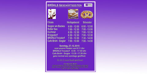 24.12.2015: Öffnungszeiten bei Bröhl´s Backkultur