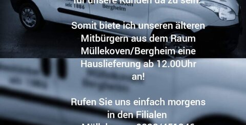 ich unser bestmögliches geben, für unsere Kunden da zu sein. Somit biete ich unseren älteren Mitbürgern aus dem Raum Müllekoven / Bergheim eine Hauslieferung ab 12 Uhr an. Rufen Sie uns einfach morgens in den Filialen Müllekoven: 0228-451346 Bergheim: 0228-451258 an!
