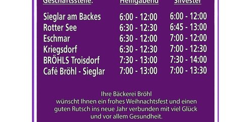 Die Filialen der Bäckerei Bröhl haben an den Feiertagen wie folgt geöffnet: