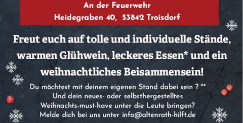 Wenn Sie mit einem Stand (neues- oder selbsthergestelltes) auf dem Markt dabei sein möchtet, können Sie sich dafür unter info@altenrath-hilf.de anmelden.