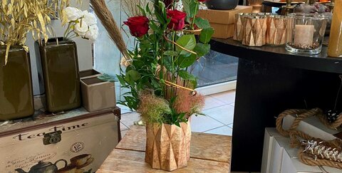 Eine treue Kundin von Blumen Odenthal hat sich eigens für diesen besonderen Anlass ein Rosengesteck in einer Kupfervase anfertigen lassen.