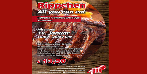 Heute Abend in der BOA: Rippchen all you can eat Special! Für 13,90€ könnt ihr so viele Rippchen essen, wie ihr möchtet und erhaltet ab 20 Uhr sogar noch 20% Rabatt auf alle nicht reduzierten Bowlingspiele. Bitte vorher in der BOA einen Tisch reservieren.