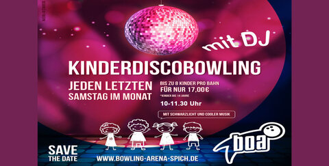 Bis zu 8 Kinder können an diesen Tagen an einer Bahn für nur 17,00 Euro spielen (Kinder bis 14 Jahren). Das Kinderdiscobowling findet von 10:00-11:30 Uhr statt.