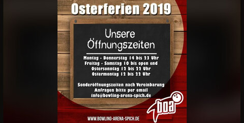 Die Bowlingarena Spich hat rund um die Ostertage zu folgenden Zeiten für euch geöffnet: