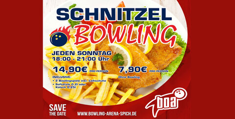 Für 14,90 Euro pro Person erhaltet ihr zwei Bowlingspiele inkl. Leihschuhe + Schnitzel mit Pommes, dazu ein Softdrink 0,2 l oder Kölsch 0,25 l.