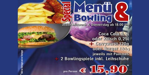 Jeden Mittwoch und Donnerstag ab 18:00 Uhr erwartet euch das Special Menü Bowling. Für 15,90 Euro pro Person erhaltet ihr zwei Bowlingspiele inklusive Leihschuhe, sowie eine Currywurst (120 g) oder ein Burger (180 g) jeweils mit Pommes und einem Getränk!