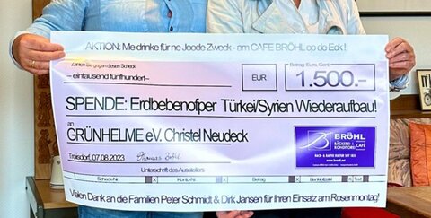 Der Slogan der Grünhelme "Mit Taten statt leeren Worten setzen wir uns für Frieden und Freiheit ein" wird durch solche Aktionen weiterhin unterstützt. Die Spende wurde im Rahmen der Aktion "Me drinke für ne joode Zweck am Cafe Bröhl op der Eck" gesammelt, bei der der gesamte Umsatz gespendet wurde.