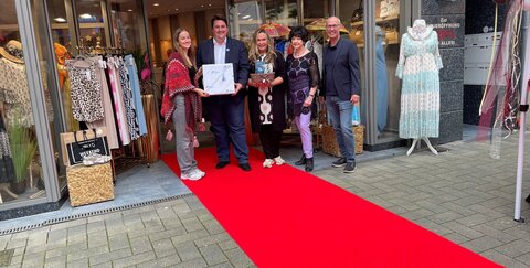 Präsent vom Bürgermeister und ein Körbchen mit Leckereien aus Troisdorf von der TROWISTA zur Eröffnung v.l.: Celine Kuhnke, Bürgermeister Alexander Biber, Natalie Nier, Sigrid Unterganschnigg und Zentrenmanager Stephan Frings
