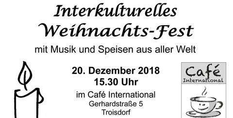 Kurz vor Weihnachten lädt das Café International ein zu einem bunten interkulturellen Fest. Es beginnt am Donnerstag, dem 20.12.2018, um 15:30 Uhr im Katholischen Gemeindehaus in der Gerhardstraße 5 in Troisdorf-Mitte
