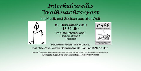Kurz vor Weihnachten lädt das Café International zu einem bunten interkulturellen Fest ein - am Donnerstag, 19.12.2019, 15.30 Uhr, im Katholischen Gemeindehaus Gerhardstr. 5 in Troisdorf-Mitte.