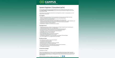 Fühlen Sie sich angesprochen? Dann freut sich Campus Computersyteme auf Ihre aussagekräftigen Bewerbungsunterlagen (Lebenslauf, Gehaltsvorstellung, Zeugniskopien).