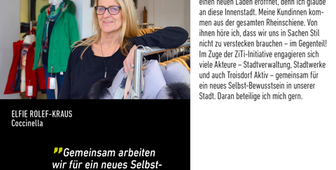 Seit 1983 bin ich Unternehmerin im Troisdorfer Zentrum. Vor kurzem habe ich einen neuen Laden eröffnet, denn ich glaube an diese Innenstadt. Meine Kundinnen kommen aus der gesamten Rheinschiene. Von ihnen höre ich, dass wir uns in Sachen Stil nicht zu verstecken brauchen – im Gegenteil! Im Zuge der ZiTi-Initiative engagieren sich viele Akteure – Stadtverwaltung, Stadtwerke und auch Troisdorf Aktiv – gemeinsam für ein neues Selbst-Bewusstsein in unserer Stadt. Daran beteilige ich mich gern.