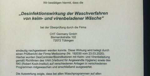 Hygiene-Zertifikat des Wäscherei-Partners Greif.