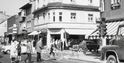 Die Kreuzung Kölner Straße/Schloßstraße/Hippolytusstraße ist geprägt durch ein historisches Eckhaus. Es beherbergte eine Drogerie, später ein Kaffeehaus und dann eine Boutique. Hinter der Backstein-Fassade befand sich früher ein Kino. Sie wurde später silbern verkleidet, und der Supermarkt Stüssgen zog ein. Das ist heute Geschichte, so wie auch der rege auf dem Foto der Heinz-Müller-Stiftung dokumentierte Verkehr. Die Kreuzung war bereits Teil der 1983 eingerichteten Fußgängerzone. Im Zuge des fünften und letzten Bauabschnittes der Innenstadterneuerung wurde auch sie komplett überarbeitet. Dieser letzte Bauabschnitt der Innenstadterneuerung mit einer Gesamtlänge von 140 Metern zwischen Von-Loe-Straße und Kreuzung Hippolytusstraße/Schloßstraße wurde in der Zeit von März bis November 2018 erneuert und am 15. Dezember 2018 offiziell der Öffentlichkeit übergeben.