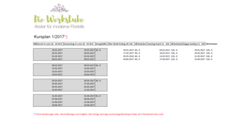 Auch im Jahr 2017 werden euch in der Werkstube viele Kurse für moderne Florisitk angeboten - Terminänderungen oder Verschiebungen sind möglich. Die Freitag, Samstag und Sonntag Workshops finden ab 3 Teilnehmerinnen statt.